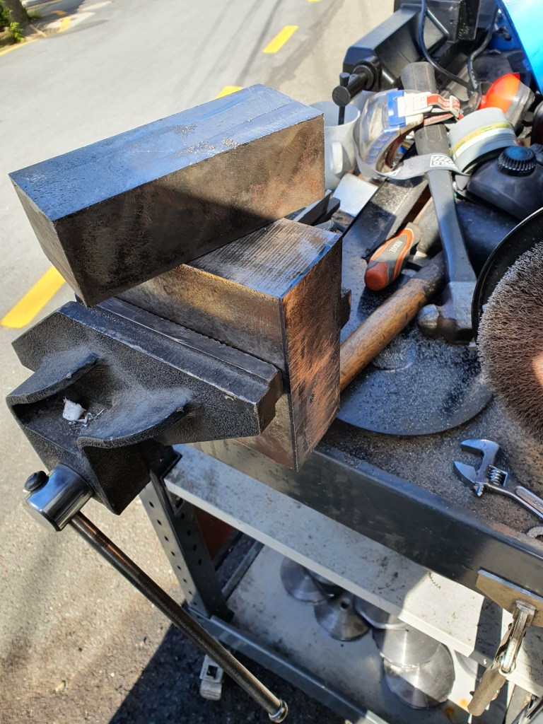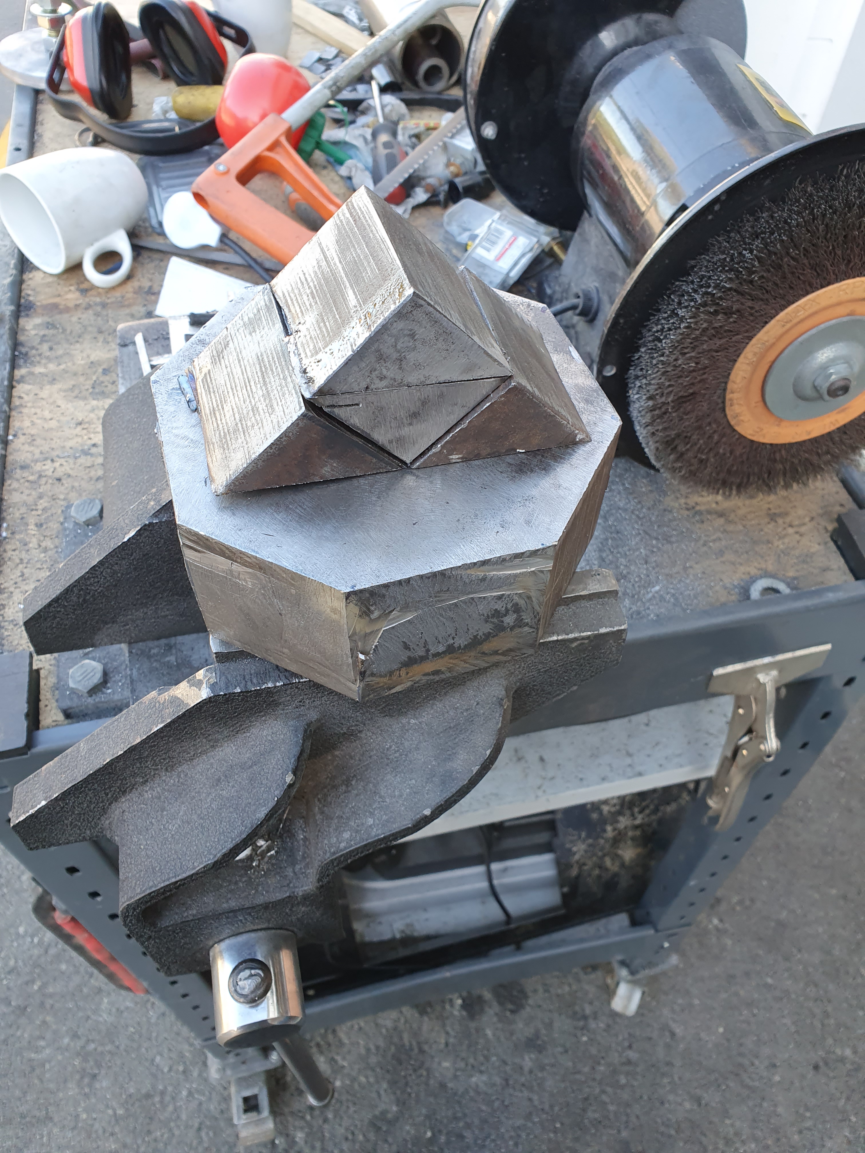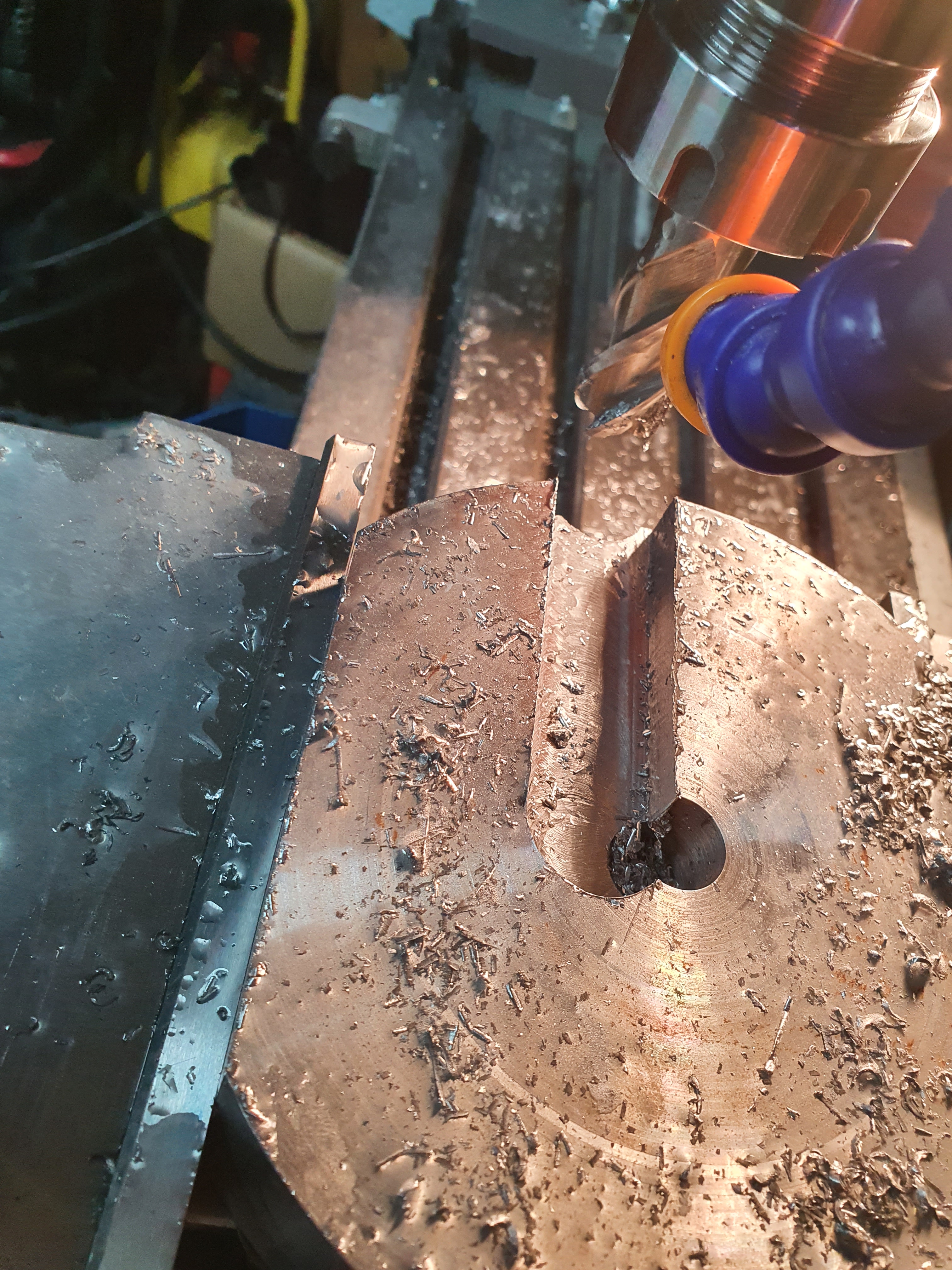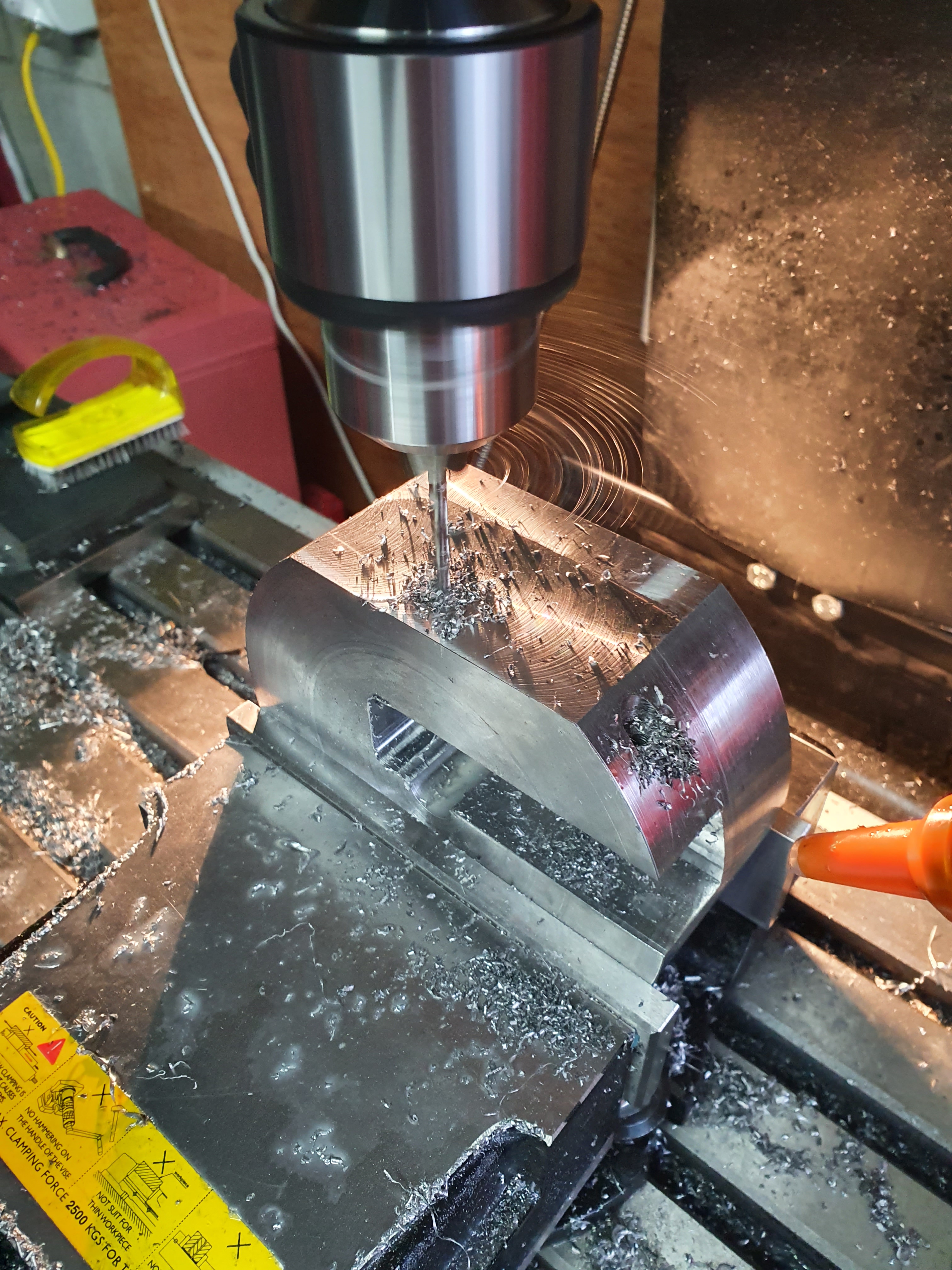 After that, into the mill for some more shaping. When it’s finished, the tool will turn an arm in the mill, with a cutting bit at the end. To give a good cut, you don’t want the cutting bit slowing down or wobbling when it hits the steel it’s cutting. To do this, we’ve chosen a large mass of steel. We cut the side off this to reduce the weight a bit, which was otherwise overkill!