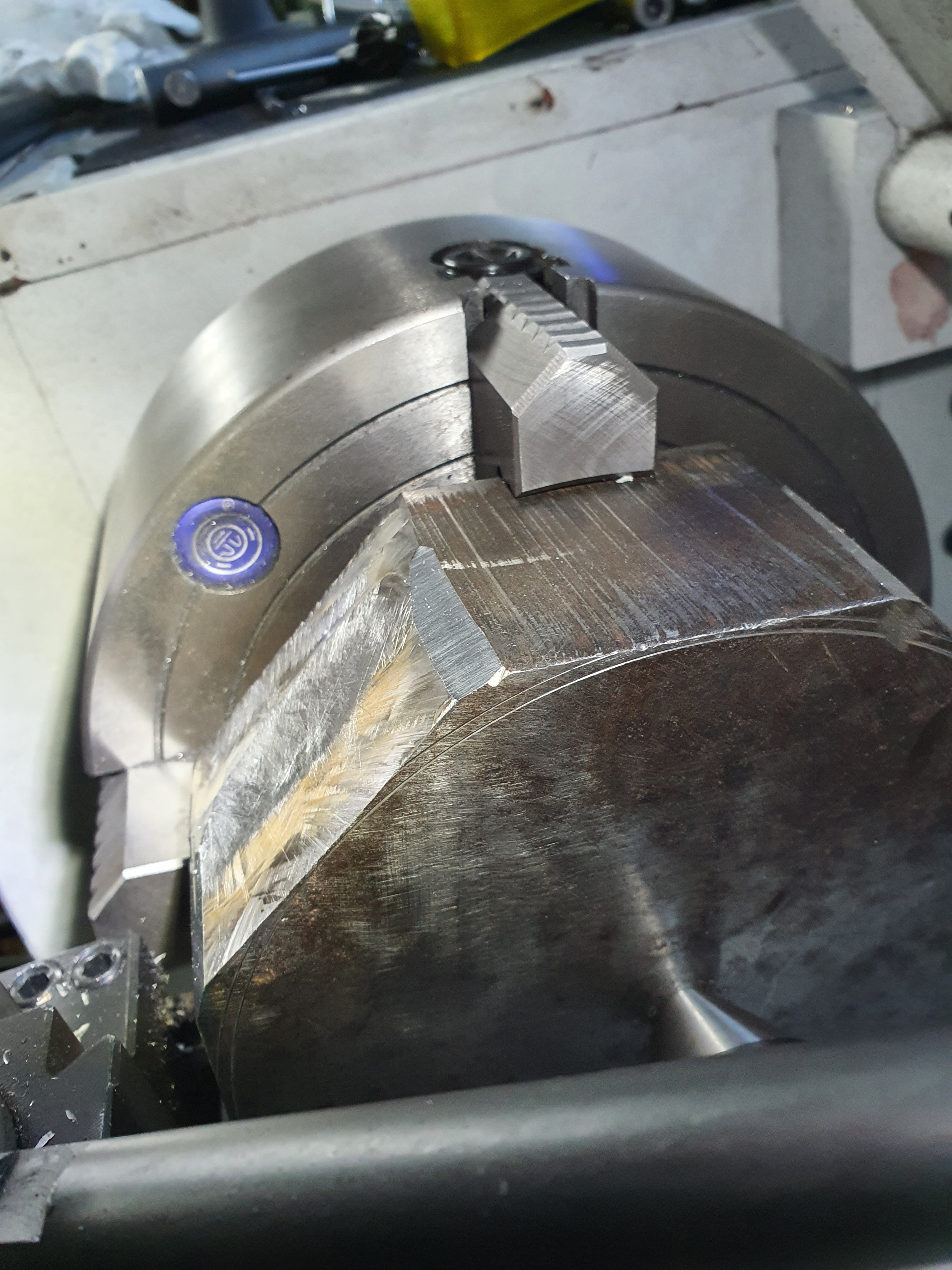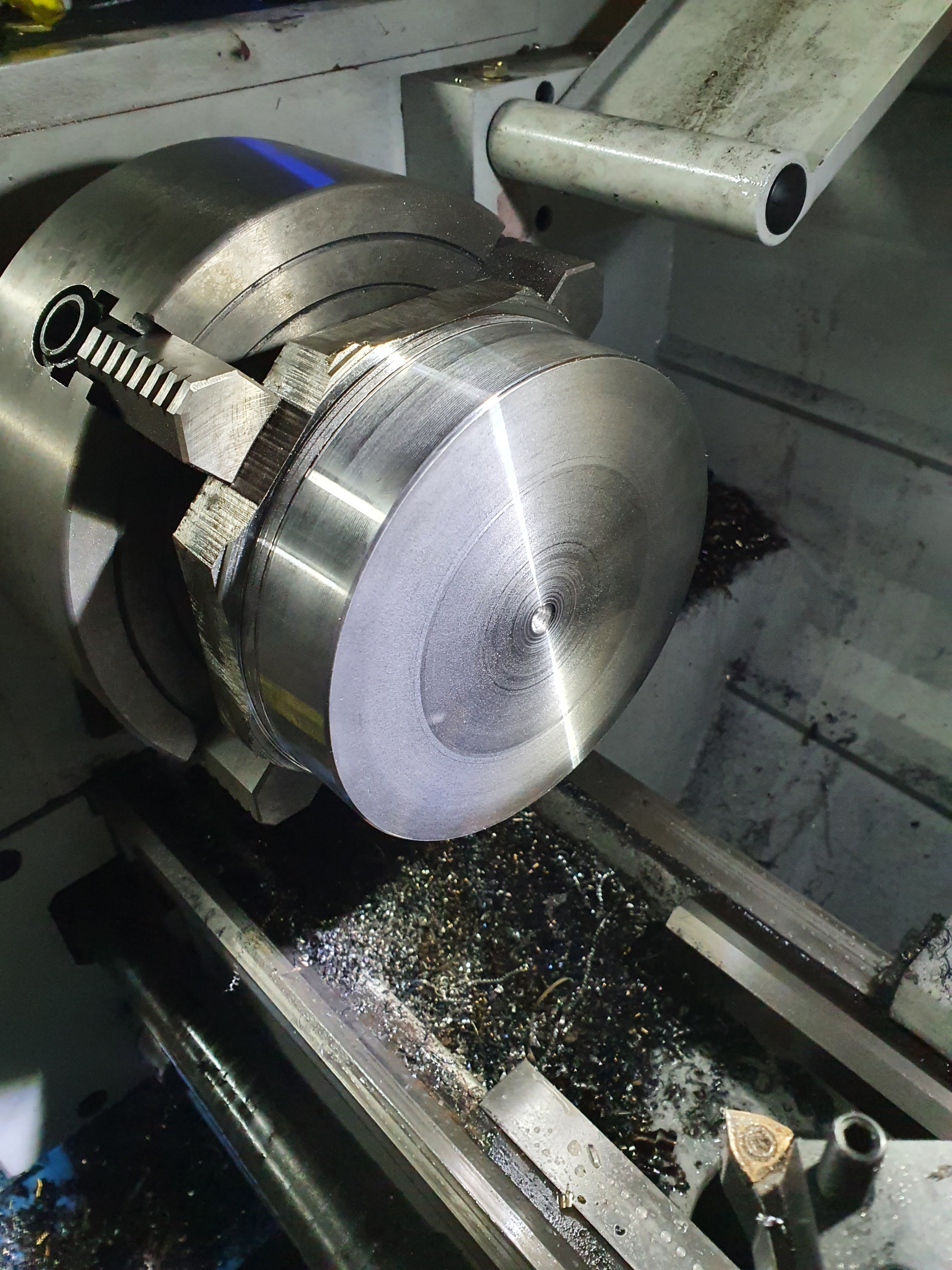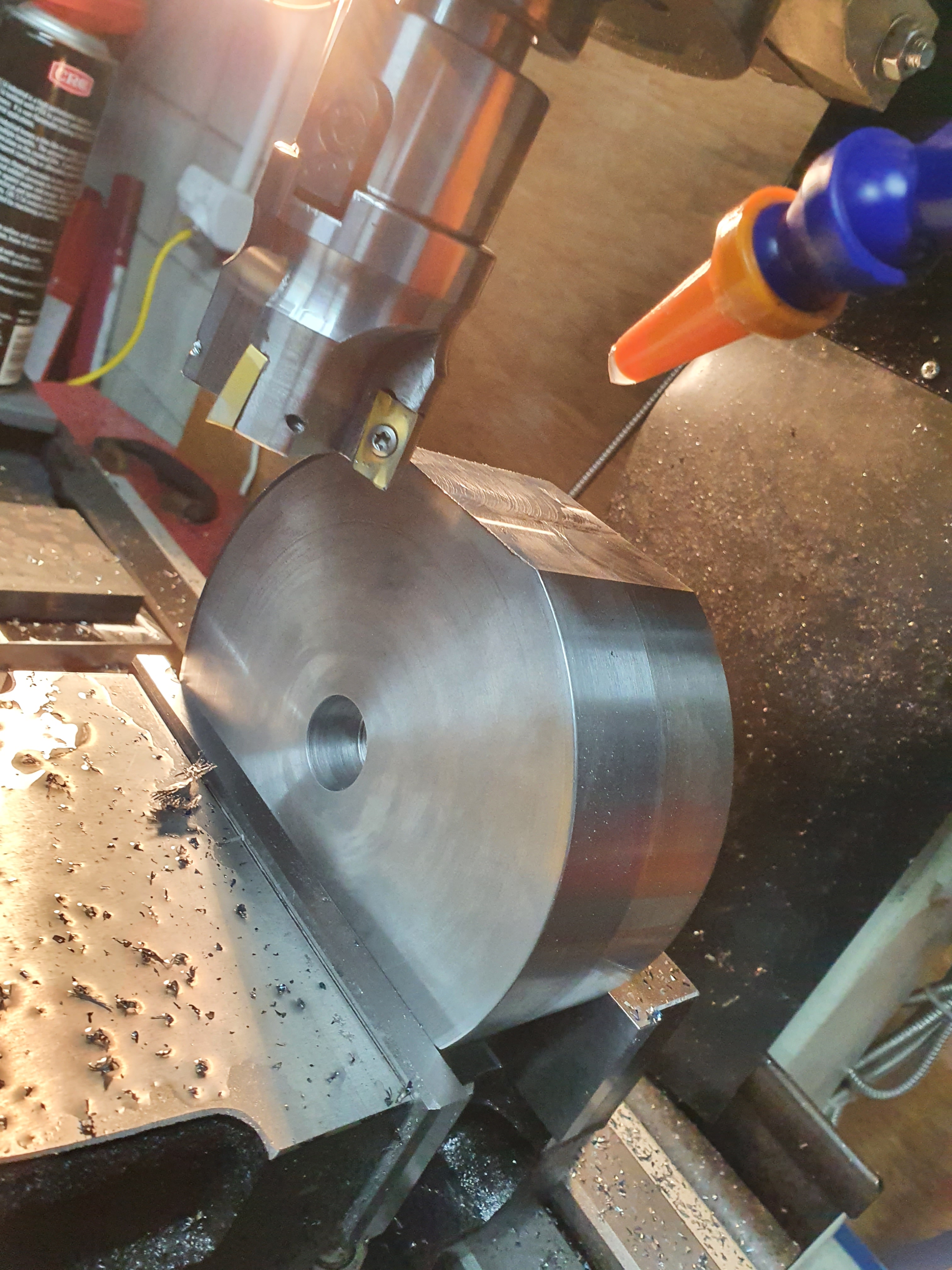 Once in the lathe, we gradually cut away at the edges to make it round. Once we did the front, we flipped it round to do the back, making it into a stubby cylinder.