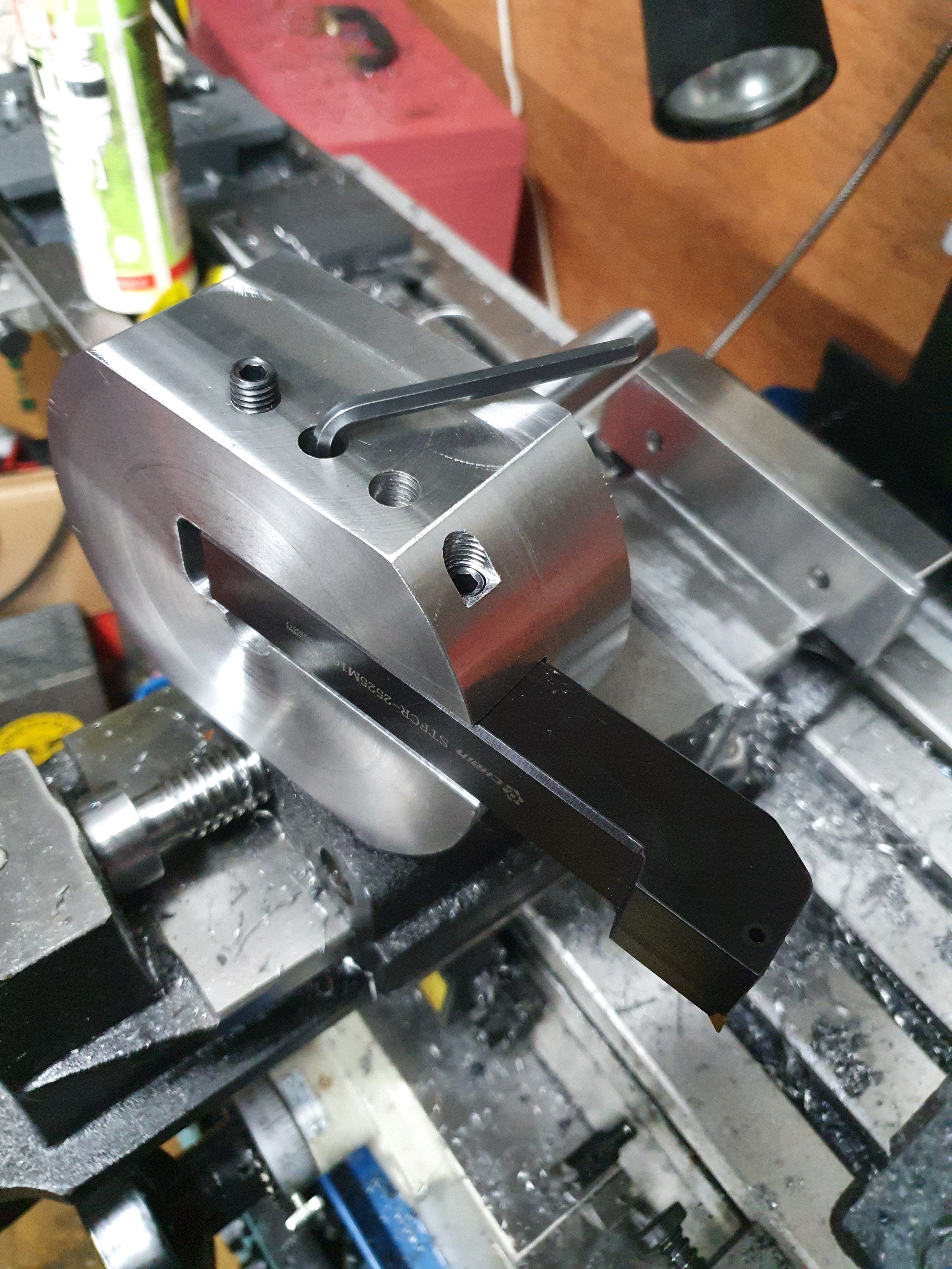 The first step is getting the raw material in the right shape. Getting round stock of the correct thickess was cost-prohibitive, so we sourced a small rectangle of steel, cut it square and then cut it into a hexagon, ready to go in the lathe. Being adaptable is one of the key things to keep costs down, and get the job done.