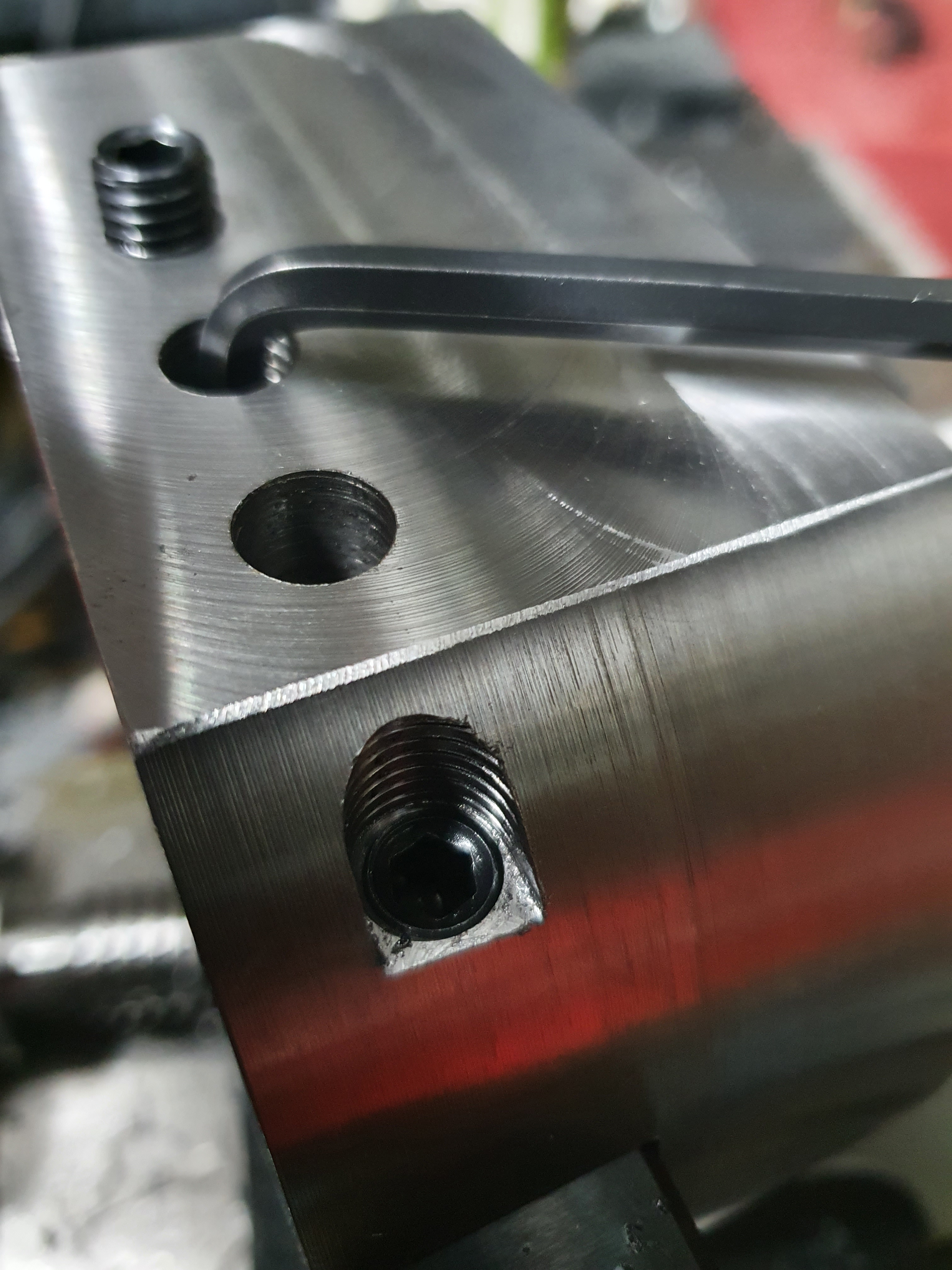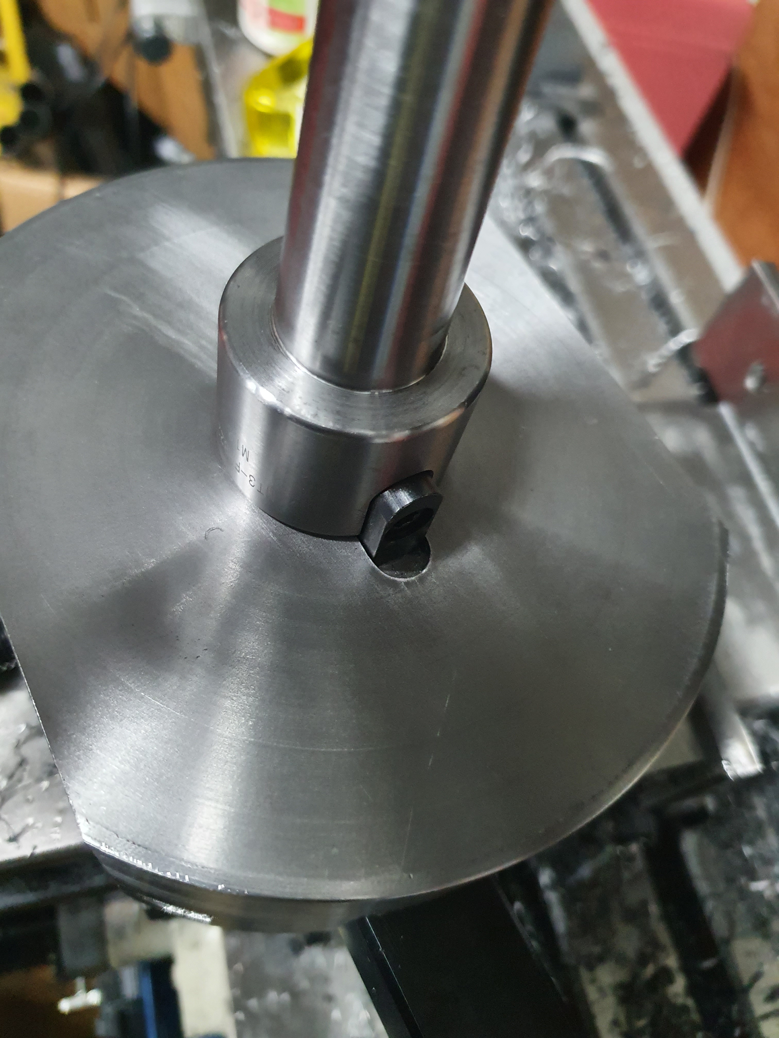 After a test fit of the arm, we drilled and tapped holes for some grub screws. The finished item will spin at 900RPM, so it’s important the fit is not only snug, but secure too.
